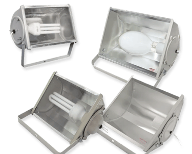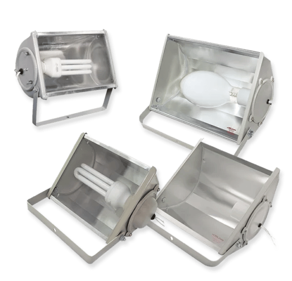 Refletor com laterais de chapa de aço tratado, com refletor interno de alumínio de alta eficiência, lentes de policarbonato de 100W a 160W e vidro temperado nas demais potências, corpo com pintura à pó epóxi.